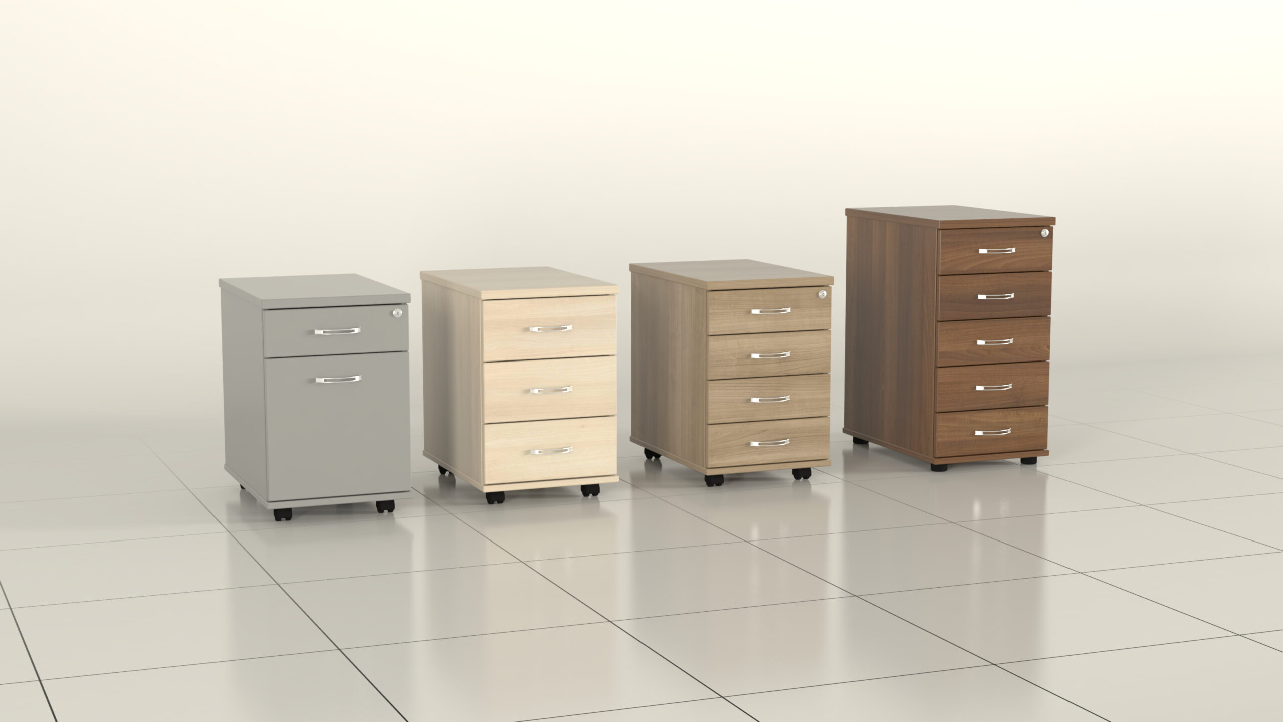 Protože jsme si vědomi nároků na zajištění bezpečnosti obsahu kontejnerů, osadili jsme většinu z nich zámky s centrálním zamykáním. Stačí zamknout jednu zásuvku a současně tak uzamknete i všechny ostatní. Usazením kontejneru na sokl dorovnáme jeho výšku na úroveň stolu, a tím zvětšíme pracovní plochu stolové sestavy.