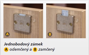 Zámek se zamyká pomocí táhel do dvou protikusů (proto dvoubodový) umístěných na půdě a dnu skříně. Zamykací táhla jsou do dveří skříně zafrézovaná a zámek je umístěný pod madly dveří. Dvoubodové zámky dodáváme pouze pro skříně velikosti OH 5 (výška 192 cm). Skříně osazené dvoubodovým zámkem mají označení např. SZR 5 80 01
